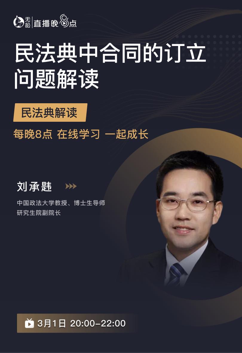 本周课程 (3.1-3.5)无讼|直播晚8点课程表 日期 主题 主讲人 3.1 周一 民法典解读 民法典中合同的订立问题解读 刘承韪 中国政法大学教授、博士生导师研究生院副院长 3.2 周二 劳动法解读 劳动法实务中的高频问题解读 程阳 北京市兰台律师事务所高级合伙人 3.3 周三 商经法前沿 民商事诉讼中电子证据运用实务 邹晓晨 天同律师事务所高级合伙人 互联网业务负责人 3.4 周四 实体犯罪辩护 死刑犯罪案件辩护要点解析 肖兴利 前高院审判长、业务指导组长 盈科刑辩学院副院长 邵知渊 前资深检察官、省级“十佳公诉人” 江苏玄览律师事务所执行主任 周猛 前高院法官 盈科南京分所律师、刑事部主任 3.5 周五 律界风向标 从货拉拉事故看网约车平台安全责任 韩炜 前北京某法院资深法官 北京大成律师事务所顾问、律师 北京互联网法院诉前调解委员会调解员 为了让大家更好的了解课程内容,我们在每期的课程中贴心为大家提炼了课程亮点,精彩内容,先睹为快! 未开通账号或未收到登录短信的律师、实习人员请及时联系所属市律协处理。 以下为本周课程具体安排,在无讼App直播平台开启新一周的学习之旅吧! 周一(3月1日) 邀请嘉宾 刘承韪 中国政法大学教授、博士生导师 研究生院副院长 直播主题 民法典中合同的订立问题解读 合同始于订立,终结于履行、解除。合同订立是启动环节,是开始和新生,后面可能发生变更、转让、解除、被撤销等诸多环节,所以合同的订立具有重要意义。 订立合同的方式有哪些?在哪些情况下订立的合同属于无效?无效的法律后果有哪些? 刘承韪老师作为此次民法典逐条精解课的主讲老师,将特别针对合同编——合同订立内容做精细化逐条精解,系统梳理合同订立的原则与程序等。 参与方式