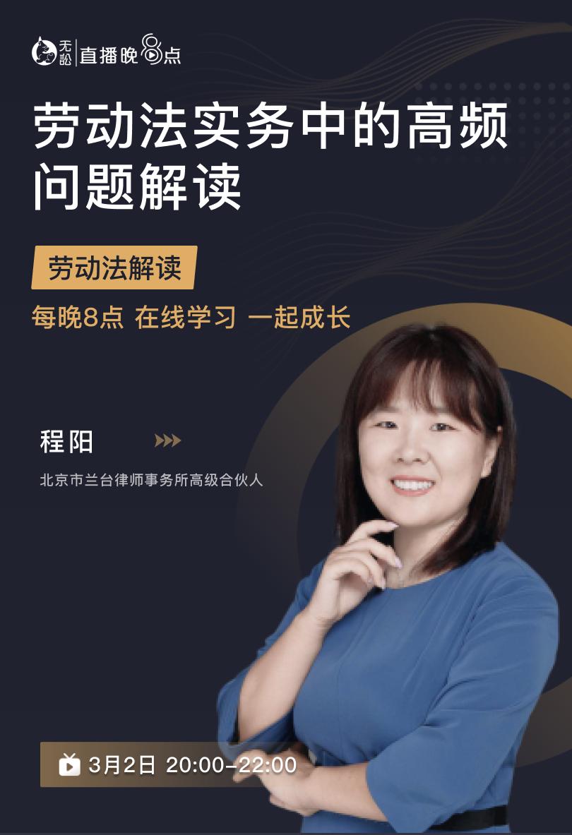 周二(3月2日) 邀请嘉宾 程阳 北京市兰台律师事务所高级合伙人 直播主题 劳动法实务中的高频问题解读 “劳动法律师核心能力20讲”现已全部更新完毕!本次课程着重从律师业务角度作为切入口,以必须了解的劳动法律知识为起点,以不同劳动法律业务为主线,不是简单基础知识的介绍,而是期待给大家带来一些思路上的启发。 为了和法律人有一个更好地交流互动机会,我们特别邀请主讲人程阳老师开展一个线上答疑会,期待可以在课程之外,系统全面地梳理课程实操中的要点、难点,结合学员的共性问题进行疑难解答,从而帮助学员“吃透”课程内容。 让我们期待程阳老师的精彩分享吧~ 参与方式