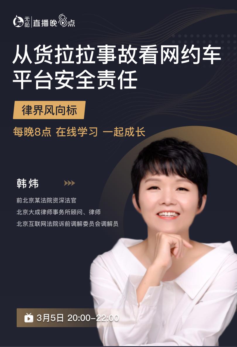 周五(3月5日) 邀请嘉宾 韩炜 前北京某法院资深法官 北京大成律师事务所顾问、律师 北京互联网法院诉前调解委员会调解员 直播主题 从货拉拉事故看网约车平台安全责任 “湖南长沙年仅23岁的车某某从货拉拉副驾驶位跳窗,后经抢救无效不幸离世”的新闻刷爆全网,受到各界持续关注。虽然目前事件尚未形成定论,但暴露出的“偏航”、“无录音录像”等问题,让众多网友对货拉拉平台提出质疑,也把安全监管问题再次引入大众视线。 从滴滴空姐被害案到货拉拉女孩跳窗,网约车安全问题频发,如何有效杜绝悲剧重演?司机如何负责?平台又该承担哪些法律责任? 本期我们特别邀请北京大成律师事务所顾问韩炜老师,为我们精细化解读货拉拉滴滴等平台的法律责任问题。 参与方式