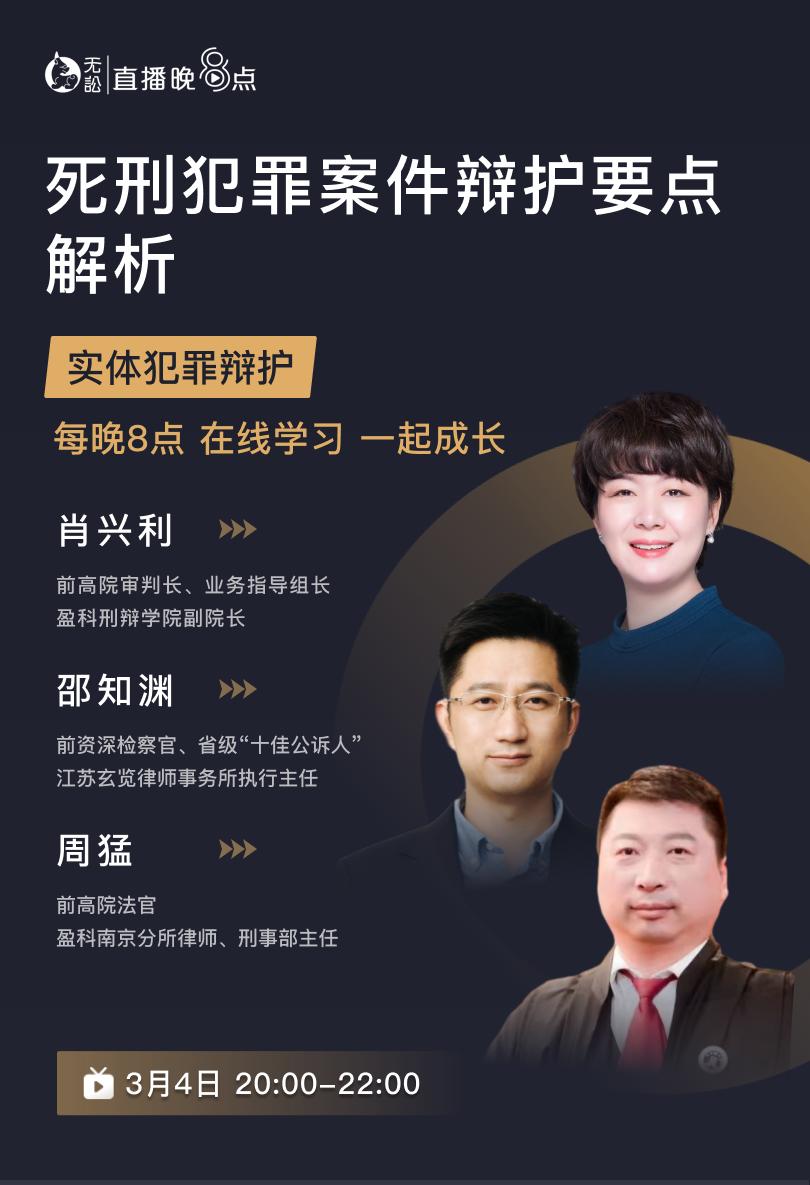 周四(3月4日) 邀请嘉宾 肖兴利 前高院审判长、业务指导组长 盈科刑辩学院副院长 邵知渊 前资深检察官、省级“十佳公诉人” 江苏玄览律师事务所执行主任 周猛 前高院法官 盈科南京分所律师、刑事部主任 直播主题 死刑犯罪案件辩护要点解析 死刑犯罪案件与一般案件相比,更容易受到各方的高度关注和重视。本期课程邀请到三位死刑犯罪案件的刑辩专家将主要从死刑犯罪案件的特点出发,围绕死刑犯罪案件证据、事实辩护要点;死刑犯罪案件法律适用辩护要点;死刑犯罪案件刑事政策辩护要点以及二审和死刑复核辩护应关注的一些问题重点展开分析和讨论。敬请关注! 参与方式